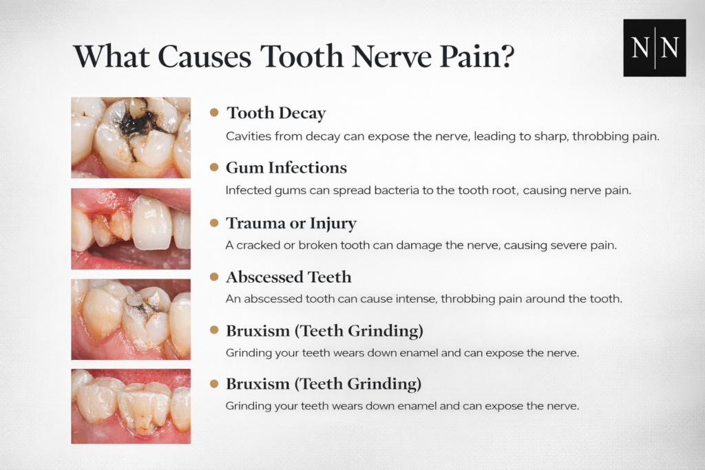 Tooth nerve pain is a sign that something is wrong with your tooth, typically involving the nerve tissue inside the tooth itself. There are several causes of tooth nerve pain, and understanding them can help you identify the right way to treat it.