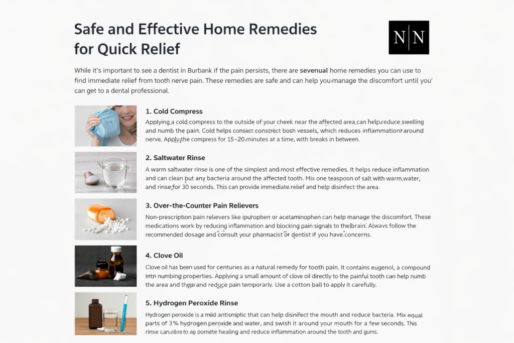 While it’s important to see a dentist in Burbank if the pain persists, there are several home remedies you can use to find immediate relief from tooth nerve pain. These remedies are safe and can help you manage the discomfort until you can get to a dental professional.